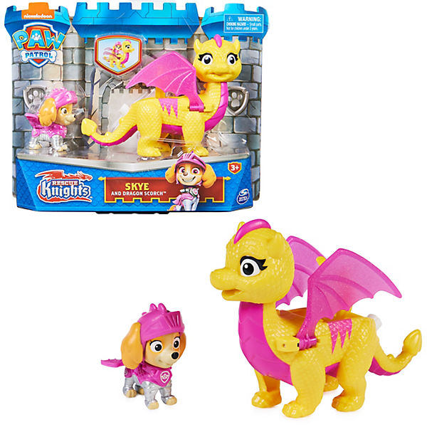 Each action figure set includes a pup and their trusty dragon pal! Wearing their Rescue Knights armor, PAW Patrol’s beloved pup is ready to jump into action. Press your pup's badge button to make their backpack’s tool transform and pop open! Then, clip your pup on to the dragon's back and push the button on the tail for its glittery translucent wings to flap! This awesome set brings all the medieval fun from the hit TV show to life. Collect all the Rescue Knights Pups and Dragon Packs (each sold separately) and use your imagination to create your own rescue missions again and again. For even more ways to play, explore the Castle HQ (playset sold separately)! The Rescue Knights PAW Patrol figures and dragons are the perfect toys for boys and girls aged 3 and up.