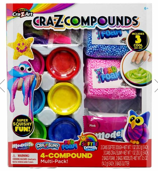Go crazy with all your favourite trendy compounds in one super fun package! Enjoy super stretchy Slimy, crunchy Fab Foam, super soft Softee Dough, and airy mouldable Modelite! Even includes glitter to add some sparkle wherever you see fit! Are you ready for this awesome sensory experience?! Each has its own incredibly unique texture! 4 different compounds for you to smoosh, stretch and explore!