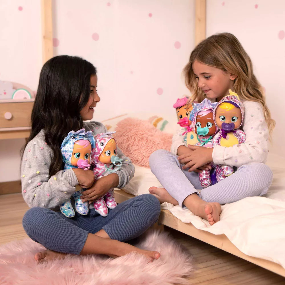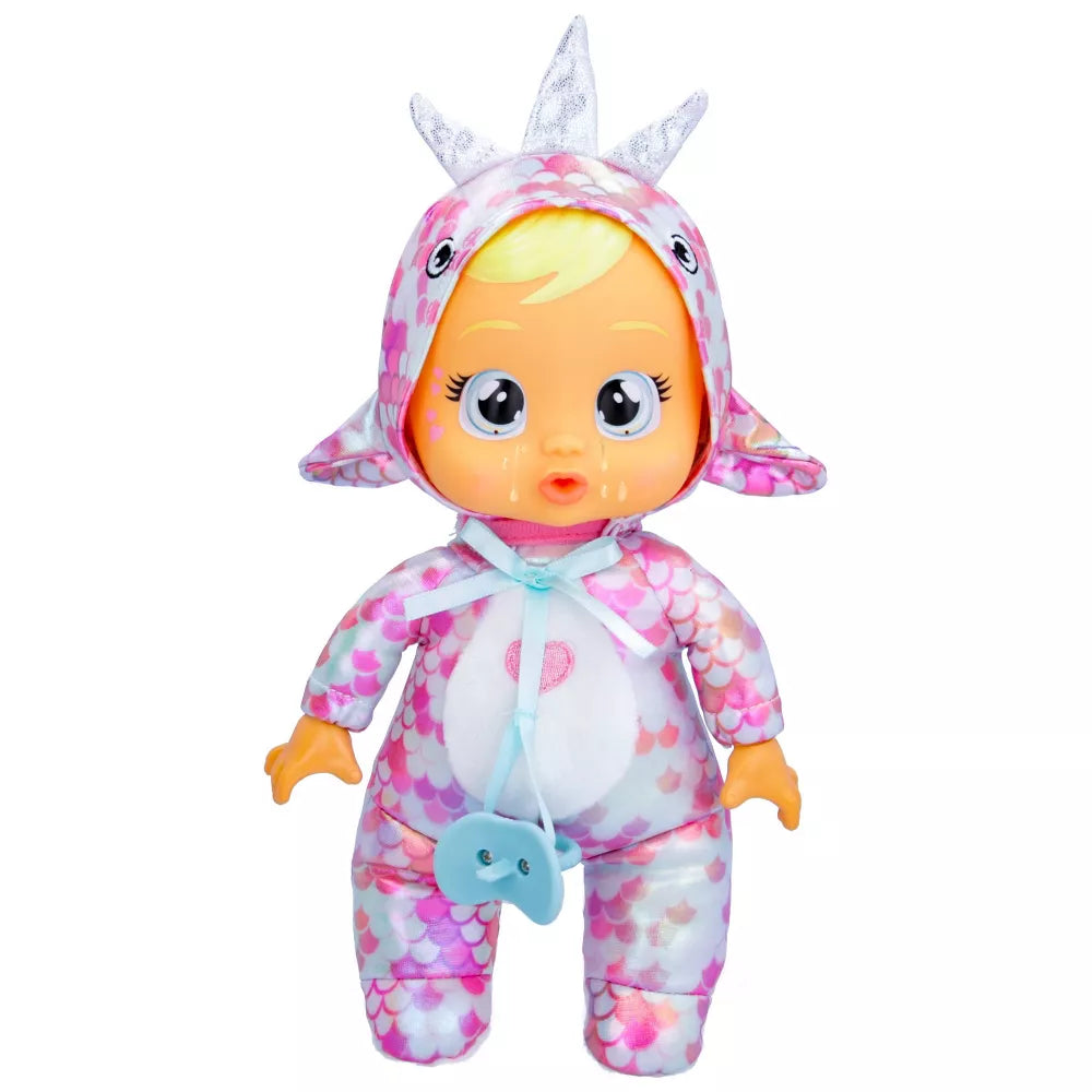 Meet the new Cry Babies Tiny Cuddles Dinos! Stella is dressed in a cute pink narwhal themed pajamas with metallic accents! Now little ones can play with the softest version of Cry Babies Dinos from Icy World! There are 5 different dolls to collect - Phoebe, Tina, Stella, Tilo and Mia! Each comes dressed in a different dinosaur themed pajamas with metallic finishes! They all cry real tears when you press their heads. They come with a matching pacifier. Age recommended 18 months and up making it perfect for little girls and boys to take on the go! Their super light weight makes it easier for little ones to carry around and cuddle with any time. Children will stay entertained with their new best friends, and engages fun imaginative play!