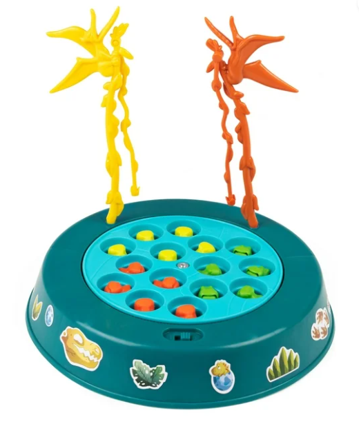The classic Fishing Game has never been more fun! This Dino Dive Fishing Game features little, dinosaurs in a spinning board. It's your job to grab the dinosaurs with your pterodactyl fishing rod as the gameboard spins. The player who collects the most dinosaur wins! Recommended for two to four players, ages four and up. Requires 2 AA batteries (not included).