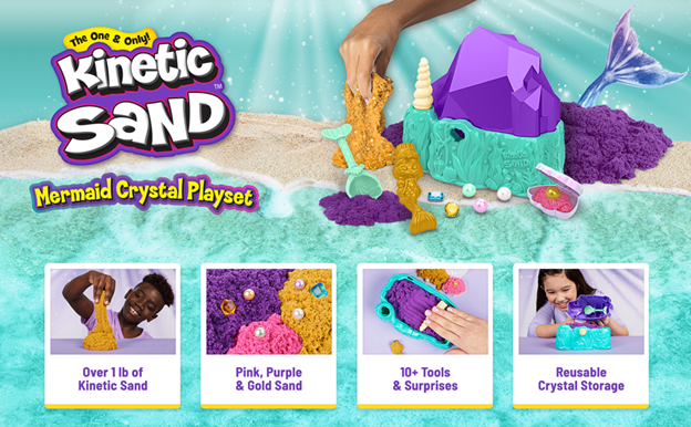 - KINETIC SAND MERMAID CRYSTAL PLAYSET: This mermaid-themed Kinetic Sand kits features Kinetic Sand tools, 1.06lbs of Neon and Shimmer Kinetic Sand, and 6+ mermaid surprises to discover!