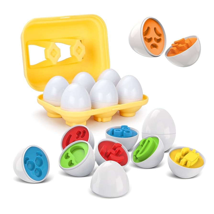 Cada huevito se abre en dos mitades con formas únicas en su interior, y el reto de los niños será emparejar las piezas correctas.