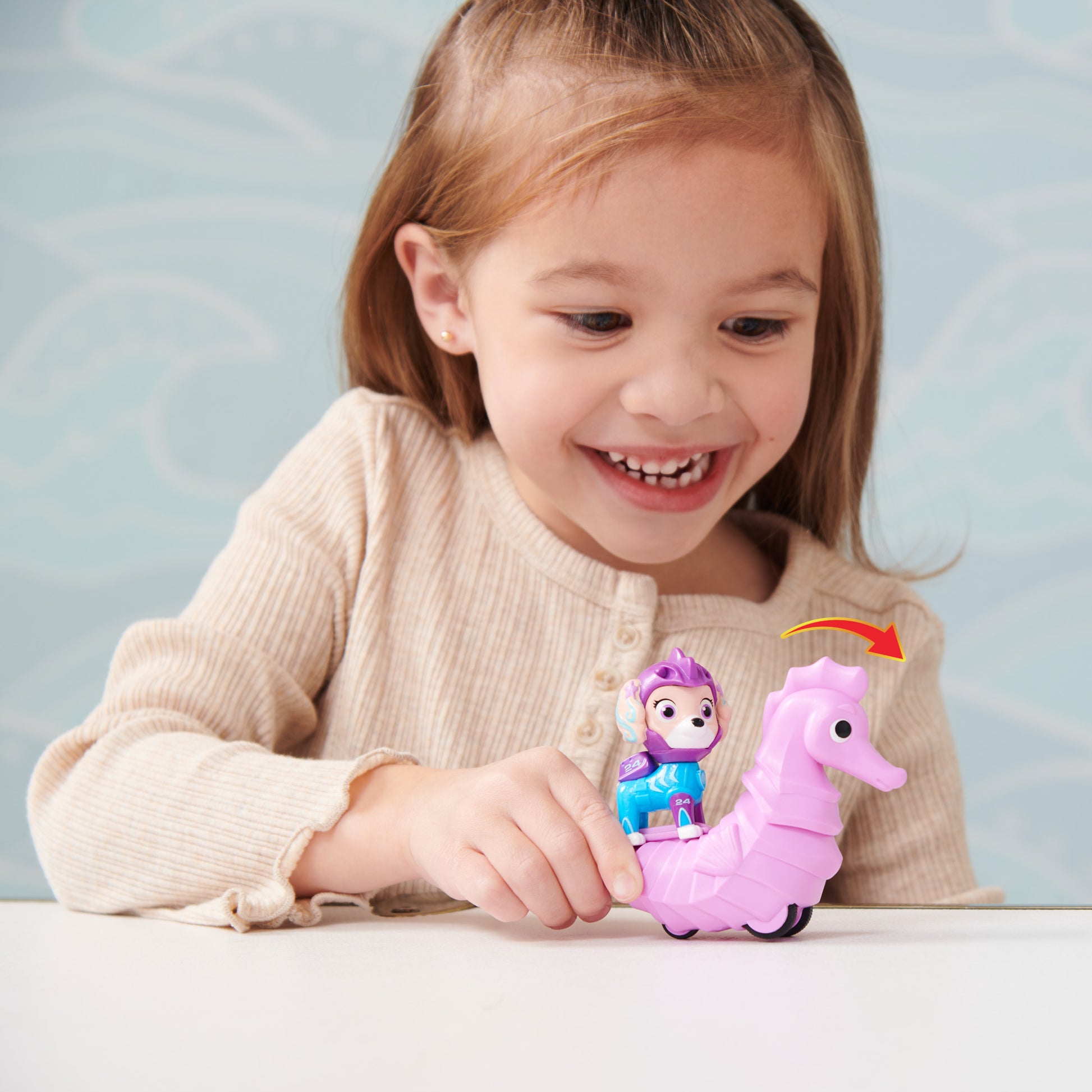 Get ready for exciting rescue adventures on the high seas with your favorite pups, and their new aquatic friends, as they go on exciting rescue missions with the PAW Patrol Aqua Pups! This action figures set includes Coral, Skye’s long-lost cousin, with her super-cute mermaid tail and her trusty Seahorse pal! PAW Patrol’s newest pup is ready to jump into action! Attach Coral onto the fin on Seahorse’s back and roll Seahorse forward, to activate her Seahorse’s head-waving movement, as you race to the rescue and save the day! Featuring authentic true-to show details and styling, this awesome set brings all the underwater fun from the hit TV show to life! Then, for even more exciting series-inspired missions, collect all the PAWsome Aqua Pups figures and toy vehicles, along with the Whale Patroller team vehicle (each sold separately) for endless hours of action-packed adventures! With PAW Patrol toys, kids can explore their imaginations and develop their motor skills, through pretend play, as they bring their favorite scenes from the show to life! PAW Patrol action figures, toy cars, playsets and stuffed animals are the perfect toys for boys and girls aged 3 and up, so bring home the excitement of the PAW Patrol: Aqua Pups!