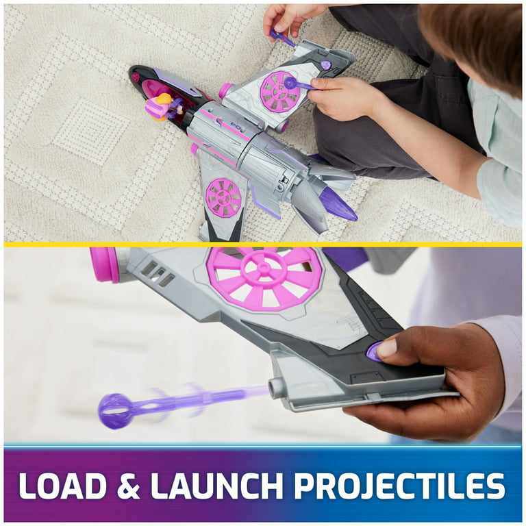 Team up with Skye and her PAW Patrol: The Mighty Movie rescue jet, for exciting rescue adventures right off the big screen! This PAW Patrol toy airplane measures over 15-inches long and over 14-inches wide, with a super-sleek design, an exciting vehicle activation and two projectile launchers, along with exciting sound effects and music, with synchronized flashing lights, that you see and hear in the movie! This deluxe Mighty Pups themed fighter jet toy would make a great gift for kids that are fans of the PAW Patrol Movie (Batteries Included)! Dressed in her pink PAW Patrol: The Mighty Movie uniform, with translucent sections and a cool helmet, clip your Skye action figure into the cockpit of her airplane toy, to illuminate multiple areas on Skye’s body and her jet plane, watch her paws light up, hear music and sound effects! When it’s time for an action packed rescue mission, hold the handle on Skye’s plane and tilt it up, down, left and right to activate sounds effects. Then, squeeze the lever on the handle to launch a barrel-roll motion of her jet’s wings and hear more sound effects, as you blast off from one mission to another! When there’s trouble, load both the projectile launchers and press the buttons on each wing to launch the projectiles to clear away obstacles and save the day! With PAW Patrol toys, a kid can explore his or her imagination and develop their motor skills through pretend play while reliving their favorite scenes from the movie! For even more fun and exciting PAW Patrol series-inspired missions, collect all the PAW Patrol movie toys, like the awesome Aircraft Carrier HQ and all the special edition PAW Patrol toys for girls and boys, like the Mighty Pups, Aqua Pups and Big Truck Pups toy figures and playsets (each sold separately) to enjoy endless PAWsome adventures with your favorite hero pup, in Skye’s PAW Patrol: The Mighty Movie Rescue Jet!