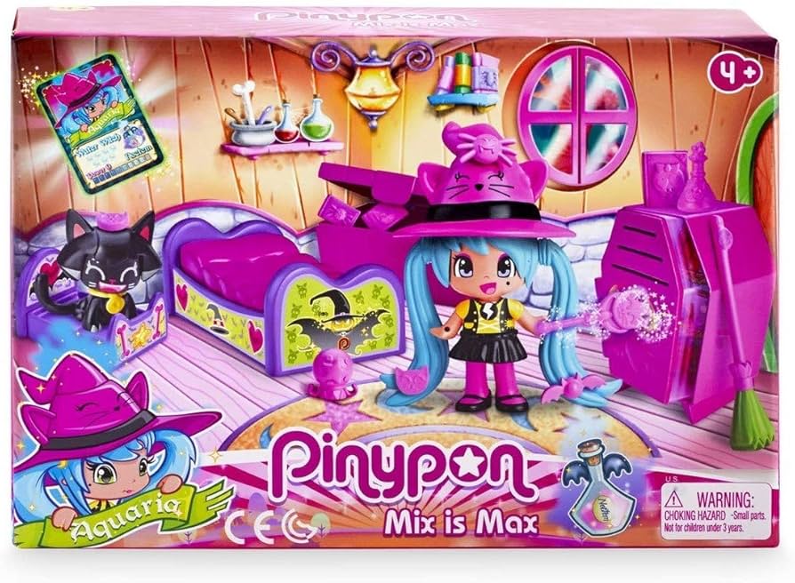Juega con este divertido set Habitación de las Brujitas de Pinypon. En esta mágica habitación, la brujita Aquaria guarda todos sus secretos ¿Podrás abrir su armario mágico?. A Betty, la gatita de Aquaria, le encanta jugar y esconderse en el armario y en el baúl. Este playset incluye : Aquaria, Betty, 2 camas, armario, baúl y más accesorios. Famosa. Ref.: 7.14715. Edad recomendada: +4 años.