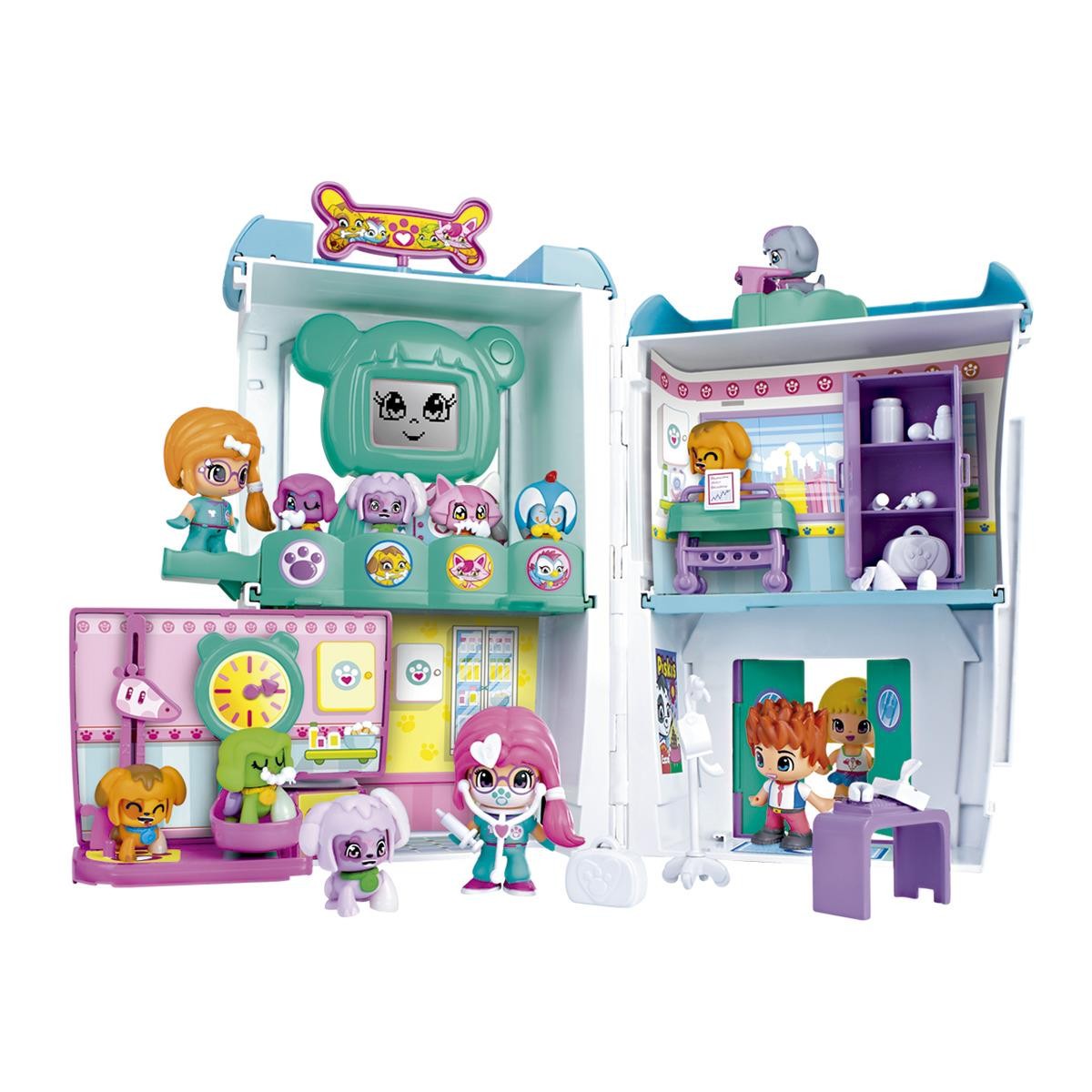 Gran hospital para cuidar a tus mascotas, con muchas zonas de juego como la recepción, la consulta veterinaria, hay una sala de cuidados, un gimnasio de rehabilitación y una gran terraza. Disponeuna cama interactiva que reacciona según el animal que necesita cuidados. Incluye 1 figura y 1 mascota. Edad +4 años.